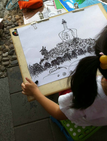 这次是画白塔,老师先讲了一下怎么取景,怎么画,注意些什么,又让孩子们看了上午别的孩子的作品,接着给孩子们发了笔和纸,大家开始动手画了。