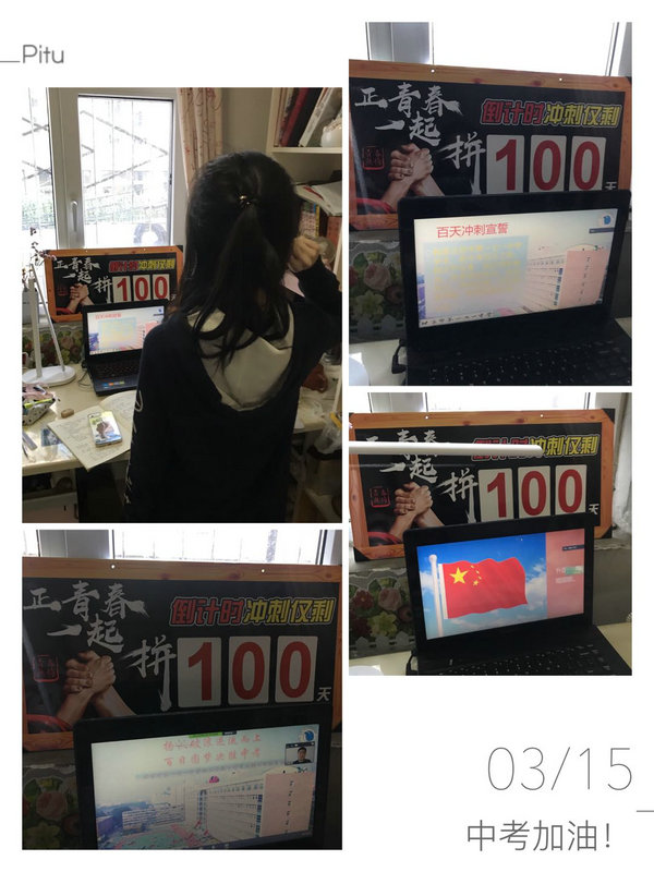大会是在下午3点半正式开始,老师要求孩子提前一个小时进入课堂,观看各个班级做的视频。在国歌声中,“扬帆破浪逆流而上,百日圆梦决胜中考”百日动员大会正式拉开帷幕。虽然不能每个同学都打开视频,但每班邀请了两名同学打开视频,一起唱。之后是学生代表讲话、家长代表讲话,年级组长、部长讲话,并对家长们提出“以充分的信任支持老师、以有力的协作助力教学、以亲情的陪伴温暖孩子”这三条建议。,最后所有同学们起立宣誓:铭记师长教诲,传承母校荣光。倍加努力,坚持拼博。日发奋进取,明朝国家栋梁。