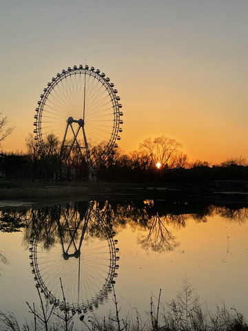 我们下午来的,转着转着太阳就要落山了。夕阳的余辉映红了半边天,树木也镶上了金边,对岸的摩天轮倒映在水中,一切都是那么美好。很多人就静静地站在湖边看日落,这一刻仿佛时间也静止一般。