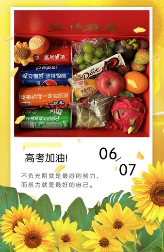 之前给她定制了刻字的饮料,又准备了一些水果:提子-金榜题名,荔枝-全力以赴,山竹-胸有成竹,橙子-心想事成,火龙果-开门红,苹果-平平安安,粽子-高中,面包-包过,巧克力-巧克难关,还有向日葵-一举夺魁……