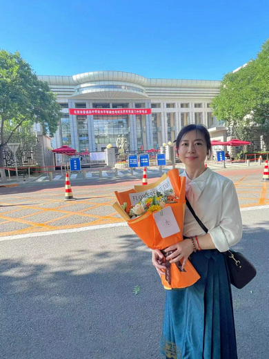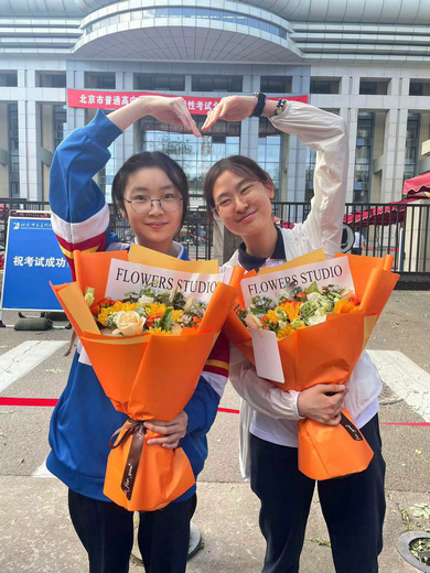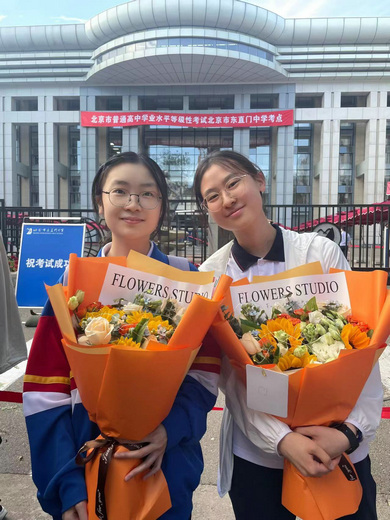因为今天是最后一门了,我给多多和妞妞订了花束庆祝。花店的人提前来送花,我们只好离开公园,到学校门口收花。这时离考试结束还有一个小时。