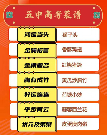 下午老师在群里发了今天晚上食堂的为孩子们精心准备的高考菜单:鸿运当头,金鸡报喜、金榜题名、胸有成竹、好运连连、平步青云、状元及第粥……