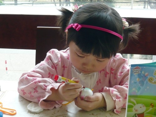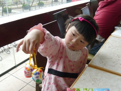 找了位置坐下来,桌上有准备好的水彩笔、橡皮泥和要制做的彩蛋,于是我们便先动手做了起来。接着又来两个小男孩了,一个五岁,一个六七岁的样子。