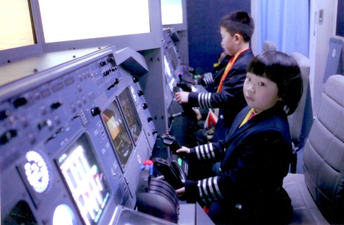 工作人员把电视切换到驾驶舱,我们看到小飞行员们认真地听着工作人员的讲解,按着要求进行飞机的操作,不过听不到声音的。