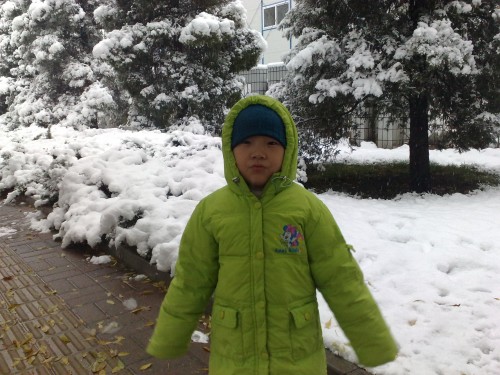 在路上顺便给多多照了张照片,这个时候下这么大的雪还是比较少见的。