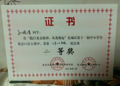 上学期参加的东城区口语大赛的结果终于颁布了,多多第一次参加这种比赛,获得了1-2年级组的二等奖。多多说学校广播里表扬获奖的同学,从三等奖开始念的名字,她只听到班上的另外两名同学的名字,她就想可能这次没能获奖。但接着在二等奖名单里居然听到了自己的名字,她真的很开心。