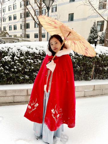 多多穿了汉服、披上红色的斗篷,举了把油纸伞,站在雪地里,看起来还挺有韵味的。