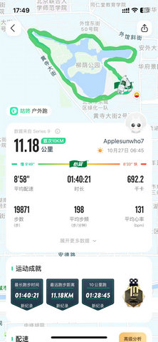 我们都是采用的小低高超慢跑,一圈一圈的跑下来并没有感觉太累,也没有呼哧带喘。六圈11.18公里,我用时1小时40分21秒,平均配速8分58,步频198,平均心率131,总体感觉还可以。多多爸比我跑的快一些。