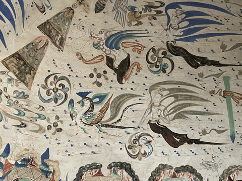 285窟,开凿于西魏大统年间。西壁绘有中国传统神话中诸神与佛教护法神的形象,力士、飞天、雷公、伏羲、女娲、日天、月天、湿婆等各路大神。简直就是神话人物大聚会。南壁上段绘有身持乐器的伎乐飞天;中段是《五百强盗因缘》故事图。