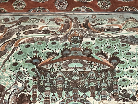 320窟,开凿于盛唐。北壁上描绘了”极乐净土“画面,宝池中莲花化生、祥禽瑞鸟与伎乐的描绘,境界优雅,色彩以青、绿、黑为主,色调清淡。不过洞窟内有大片的缺失,在1942年被美国人盗窃了。真是可惜。